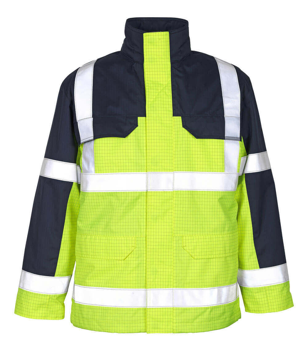 Fluoreszkáló, függőleges és vízszintes fényvisszaverő szalagokkal. Kétszínű. Antisztatikus, savvédő és lángálló. Lélegző, szél- és vízálló. Taped varratok. Kivehető bélelt bélés. Kétirányú cipzárral, dupla viharzárral és rejtettpatentokkal záródik. Mellzsebek patenttal. Elülső zsebek patenttal. Húzózsinór a derékon. Borda (viharrészbe elrejtve) a mandzsettán. Gumi a mandzsettán. Kapucni patentok.