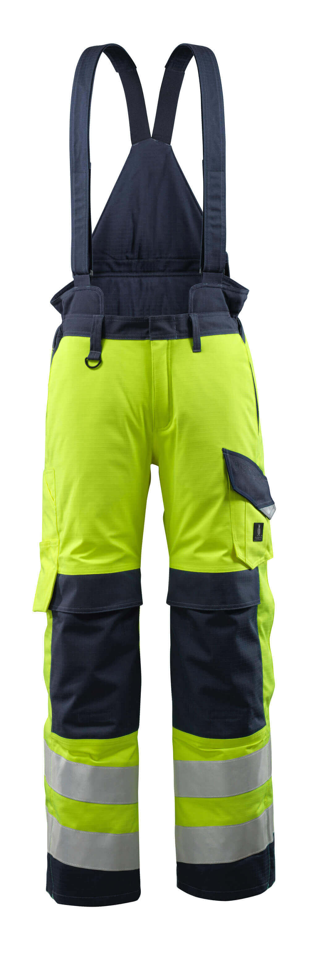 Kétszínű. Fluoreszkáló és fényvisszaverő szalagokkal. Szennyálló. Antisztatikus, savvédő és lángálló. Véd az elektromos ívektől és az alkalmi hegesztőívektől. Lélegző, szél- és vízálló. Szigetelt varratok. Bélése paplan. A levehető merevítők erős elasztikus övhurokból készültek. D-gyűrű. A derékpánt hátul magasabb, hogy jobban védjen a hideg ellen. Cipzárral ellátott slicc. Elülső zsebek. Hátsó zsebek megerősítéssel, rejtett patentokkal. Combzseb patenttal és rejtett nyomógombokkal. Telefonos combzseb. Megerősített vonalzó zseb. Állítható térdvédő zsebek patenttal és felső hozzáféréssel. Cipzár viharzárral a lábszár külső oldalán. Ehhez a modellhez a 00718-100, 00418-100, 50454-916 és 20118-915 térdvédőket ajánljuk. Az EN 14404 szabványnak megfelelően a SHORT vagy LONG típusú térdvédővel együtt tanúsított.