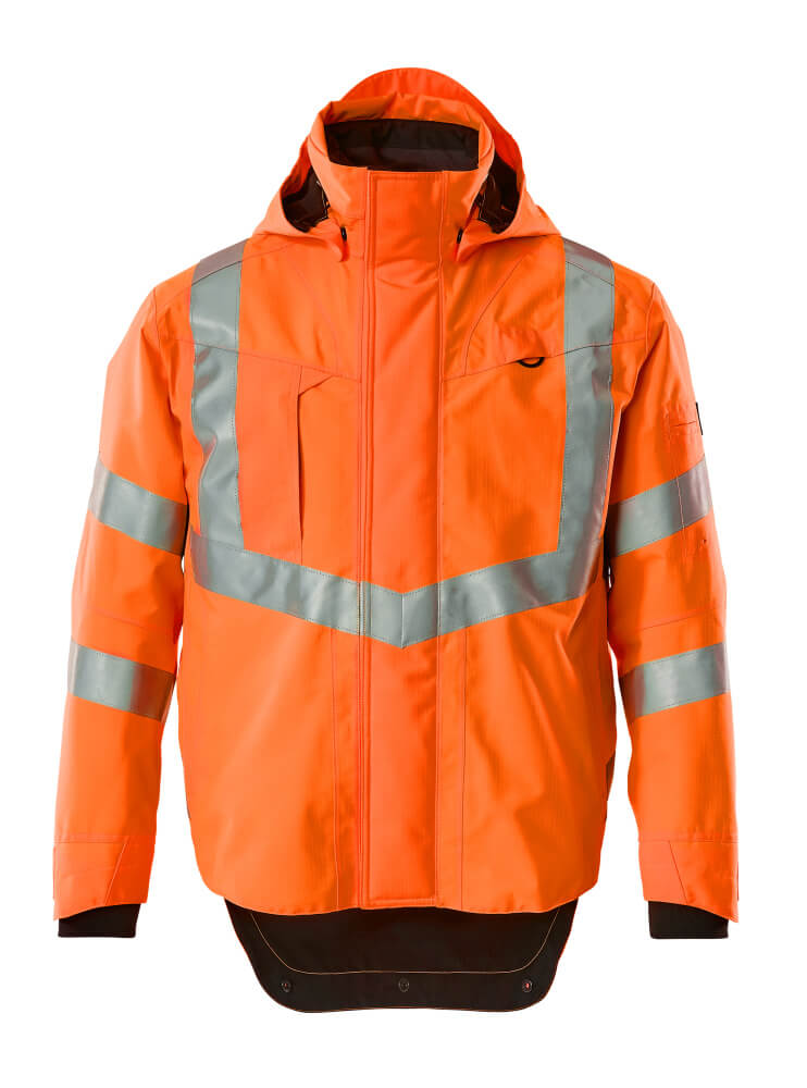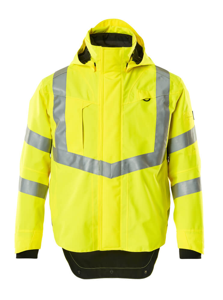 Fluoreszkáló, függőleges és ferde, keresztirányú fényvisszaverő csíkokkal. Lélegző, szél- és vízálló. Taped varratok. Bélés hálós anyagból. Levehető bélelt kapucni, amely a húzózsinór segítségével a sisak fölé igazítható. Állítható drót a kapucni mindkét oldalán. Hálós szellőző az ujjak alatt - cipzárral nyitható. Magas gallér. Bordázott belső gallér. Vízálló tolltartó zseb az ujjon. Cipzárral és patenfos viharvédővel zárható. Cipzáras belső zsebek a viharpántok alatt - az egyiket kifejezetten a mobiltelefon számára tervezték, lyukakkal a headset vezeték számára és vezetőhurokkal, hogy a vezeték hozzáférhető maradjon. Cipzáras zseb a viharpántok alatt, amely elég nagy egy 7 hüvelykes táblagép befogadására. A kabát hátulján lévő patent felhajtható a normál háthosszúsághoz, vagy kioldható a meghosszabbított háthosszúsághoz. Mellzseb cipzárral. D-gyűrű. Ergonomikusan kialakított ujjak nagy mozgásszabadságot biztosítanak. Bordázott belső derékpánt a hideg távoltartása érdekében. CORDURA® anyaggal megerősített mandzsetták patentos rögzítéssel. Elülső zsebek cipzárral.