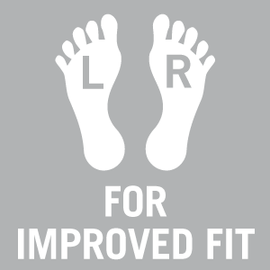 A jobb illeszkedés érdekében Speciális bal és jobb oldali zokni, amelyek a jobb illeszkedés érdekében kontúrozottak.